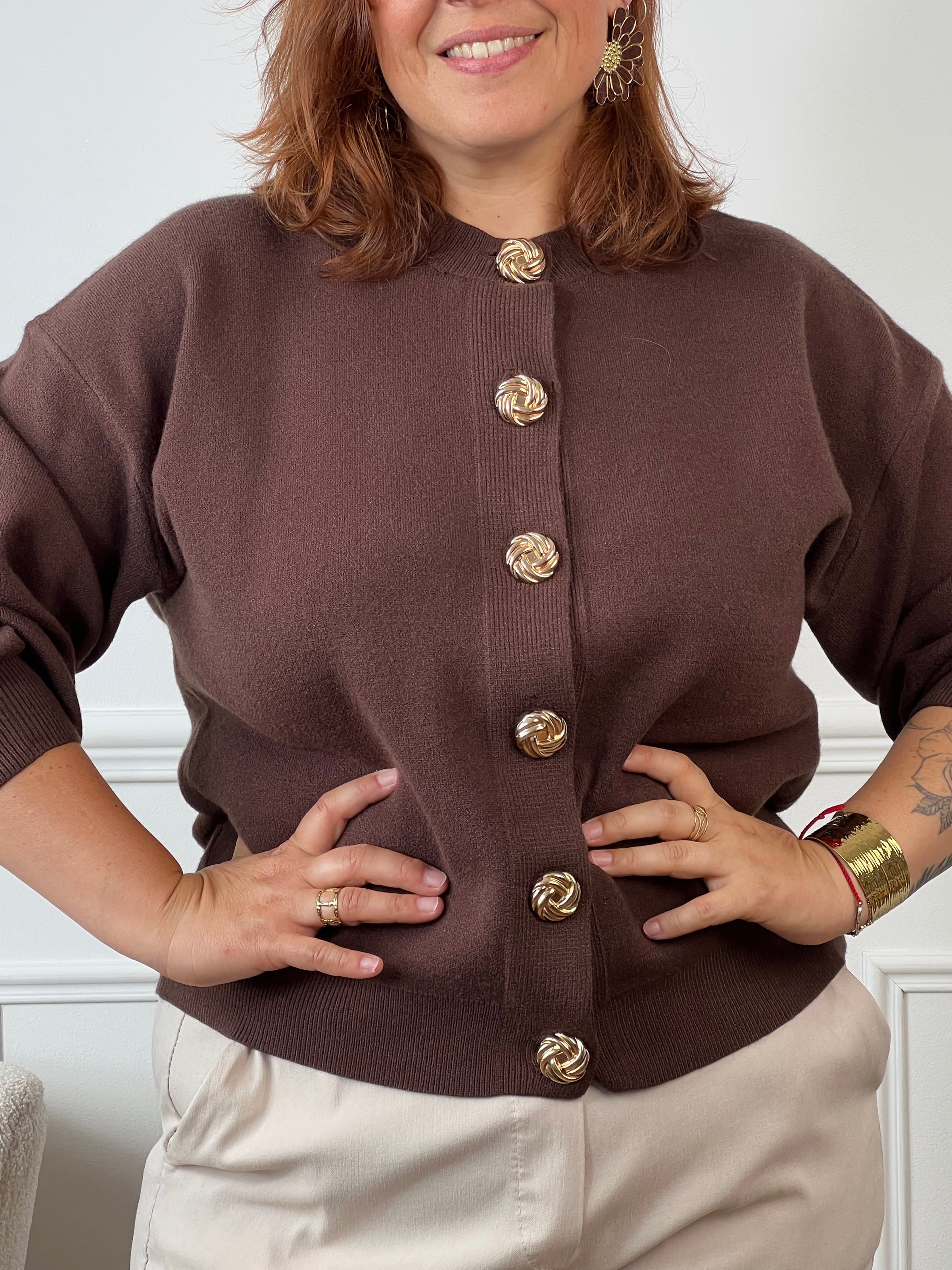 Ce gilet marron présente une coupe courte et féminine. Ses manches longues et son col rond offrent confort et élégance. Les boutons dorés sur le devant ajoutent une touche raffinée, tandis que l’étiquette discrète sur un côté souligne son authenticité.