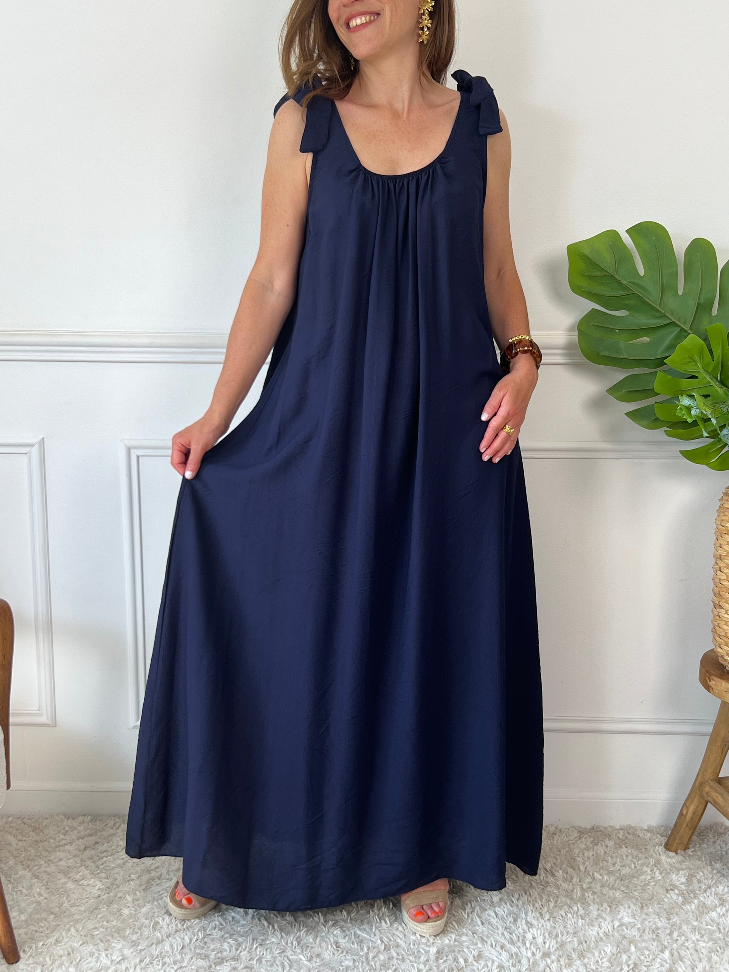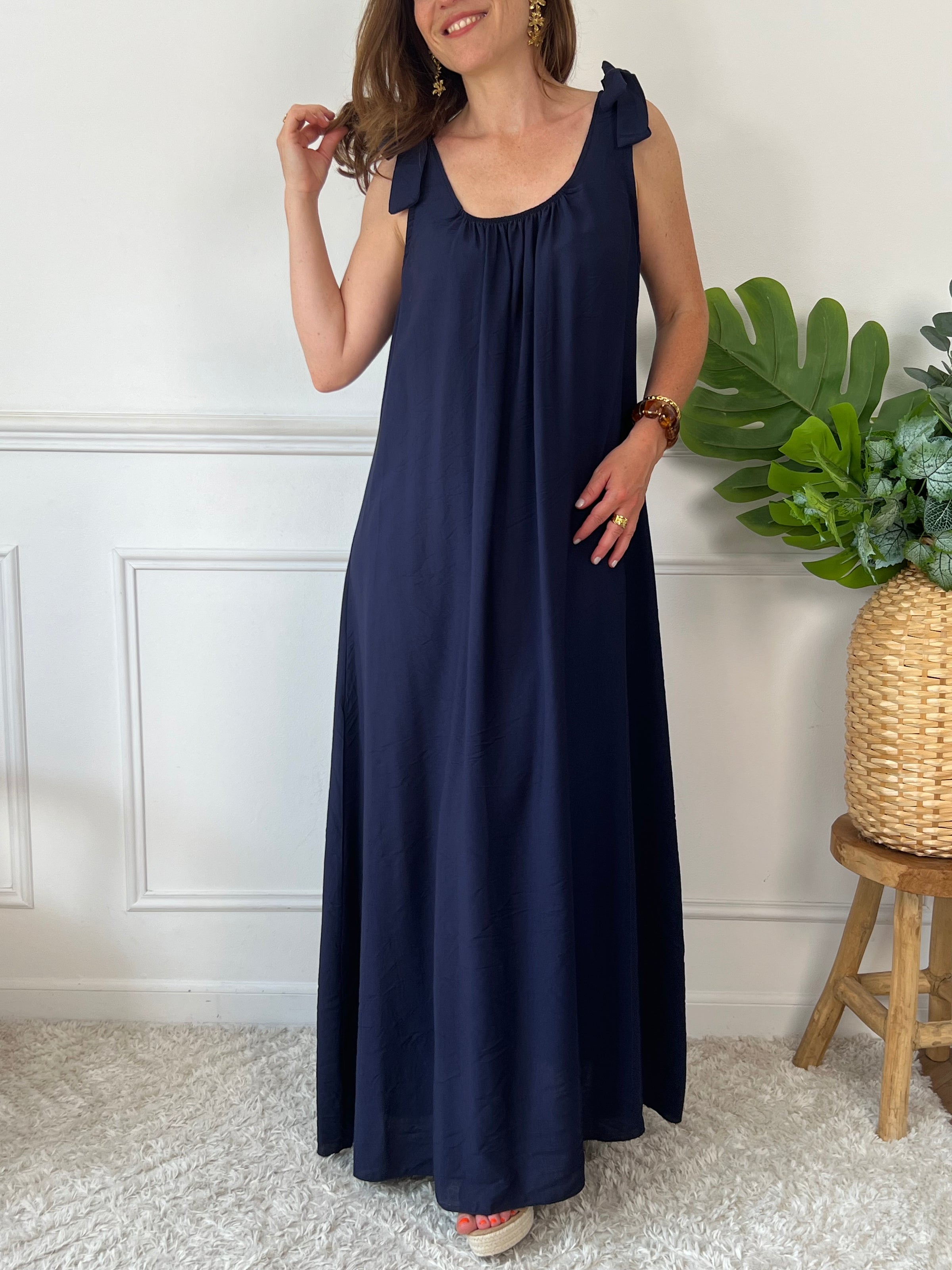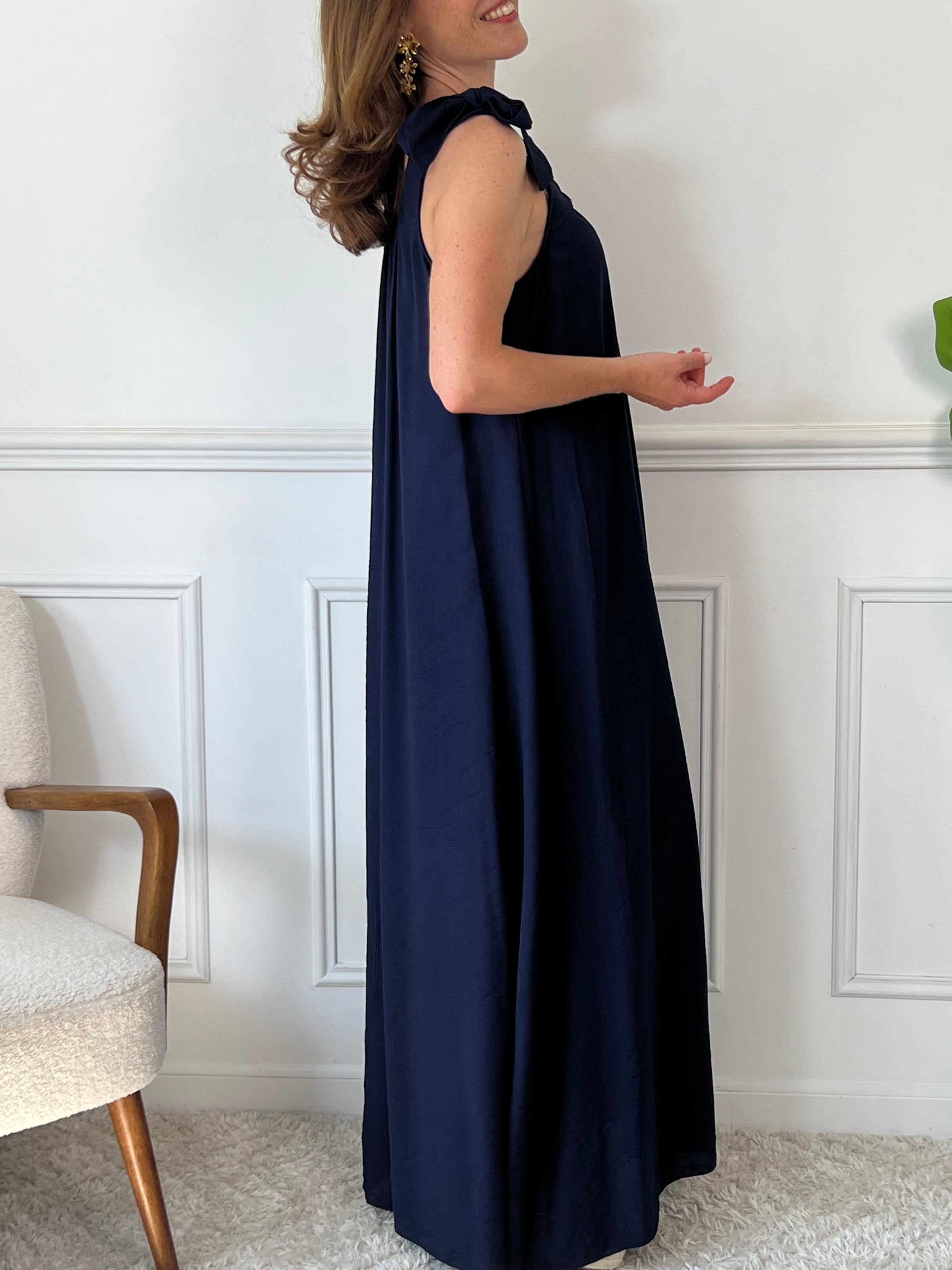 Sa coupe ample assure un confort optimal tout au long de la journée. Sans manches, elle présente des liens à nouer aux épaules pour une touche élégante et ajustable. Son col rond, à l’avant comme à l’arrière, est agrémenté d’un élastique qui garantit un maintien parfait sans contrainte.