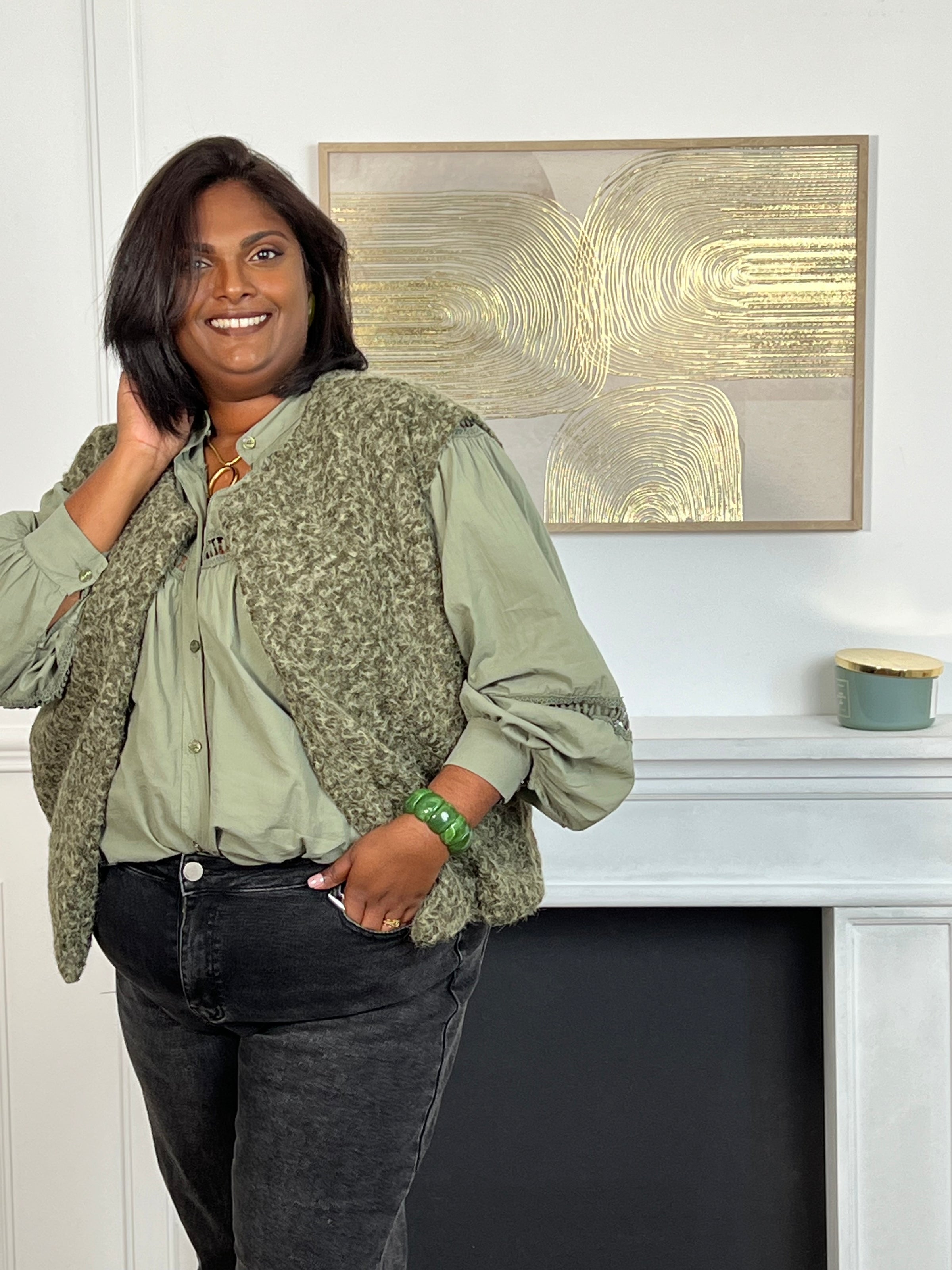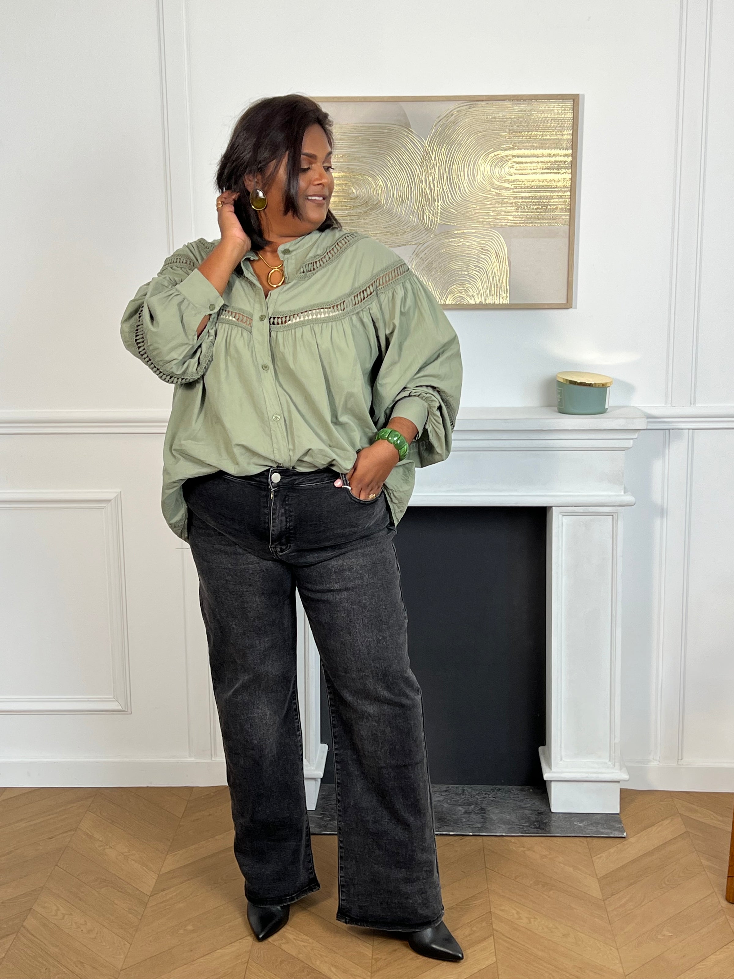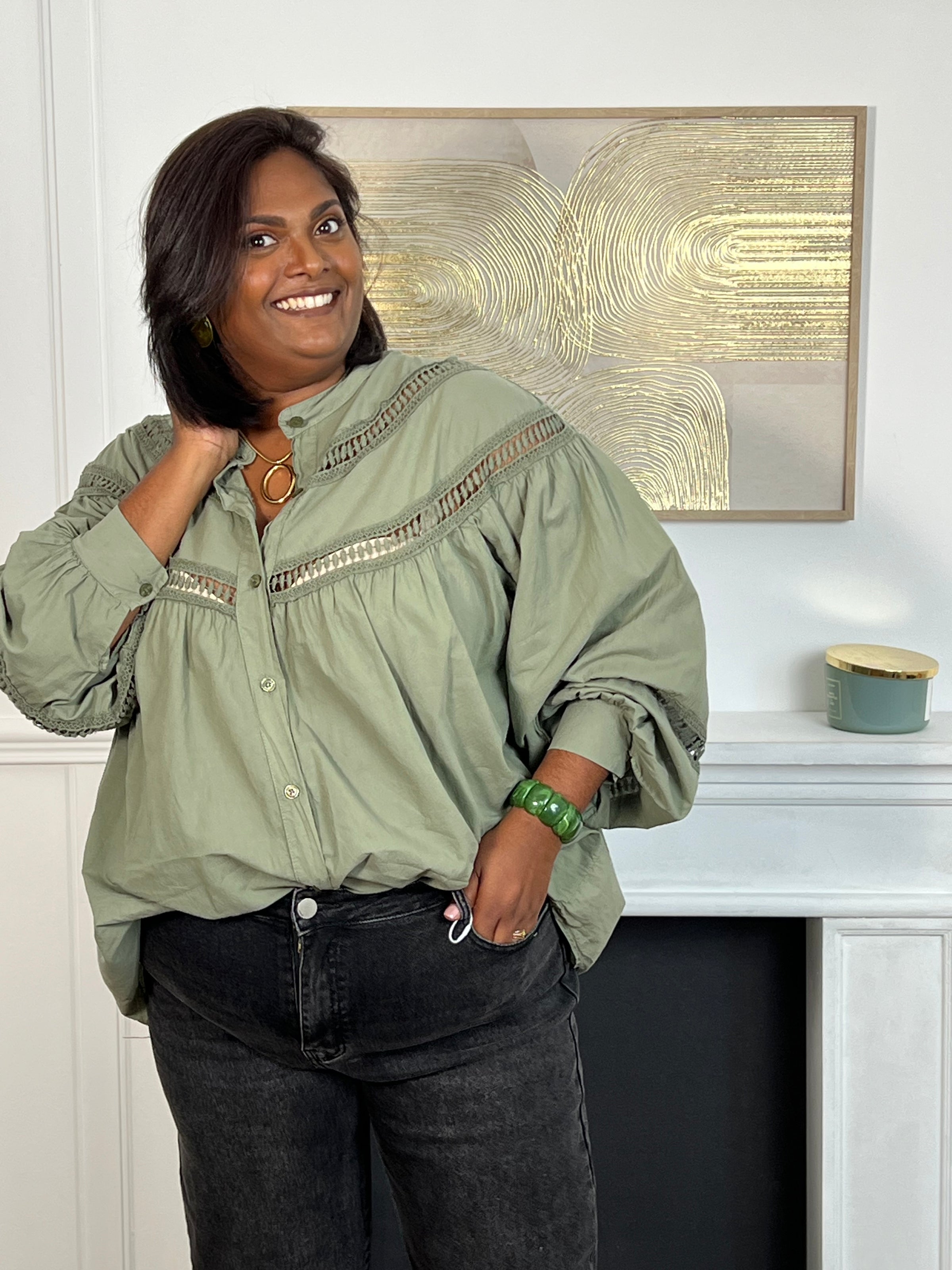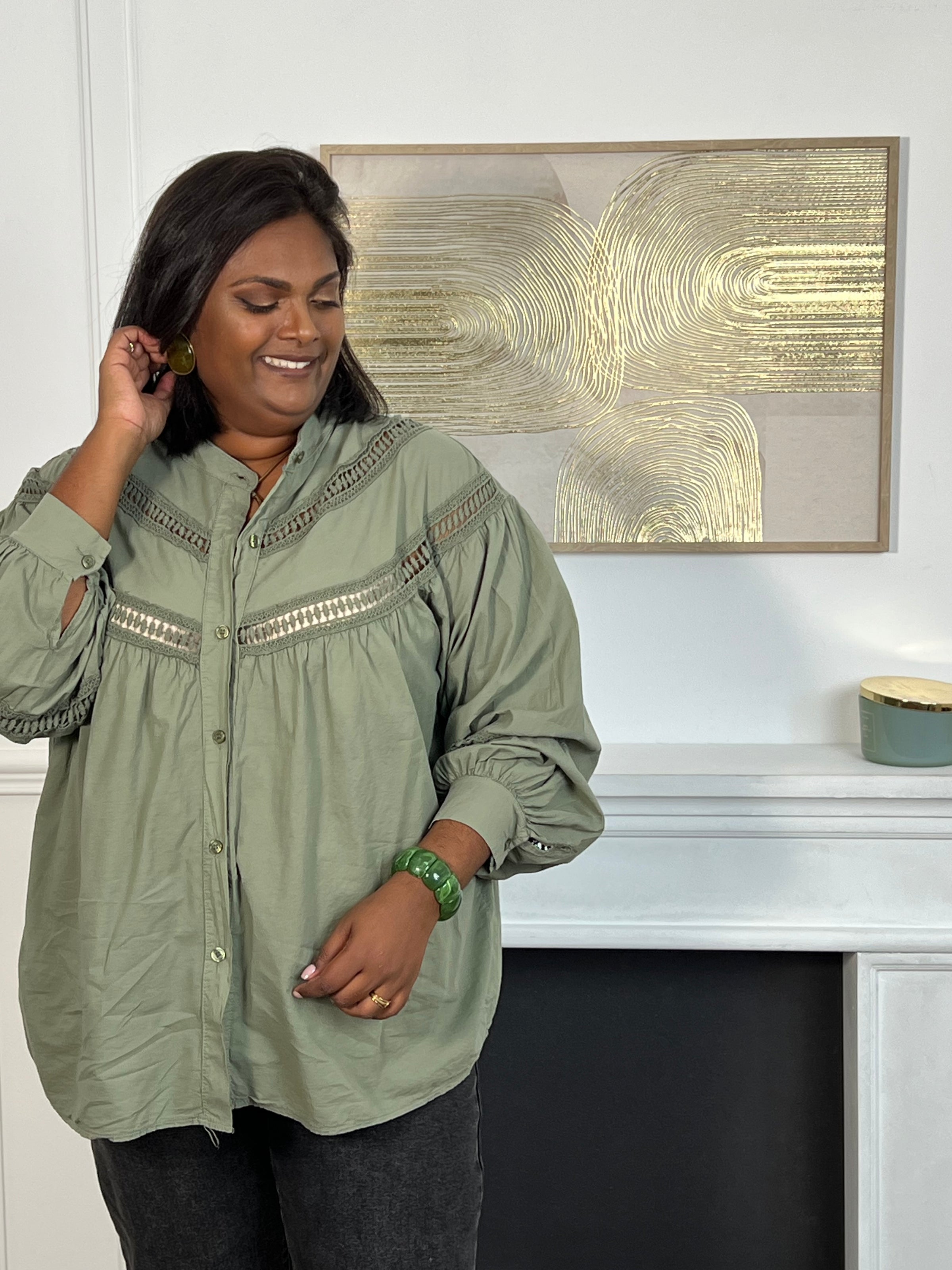 Cette chemise kaki manches longues Angelina est à la fois élégante et pleine d'esprit. Parfaite pour ajouter une touche de fantaisie à votre tenue avec ses boutons et broderies uniques sur le devant et aux manches.