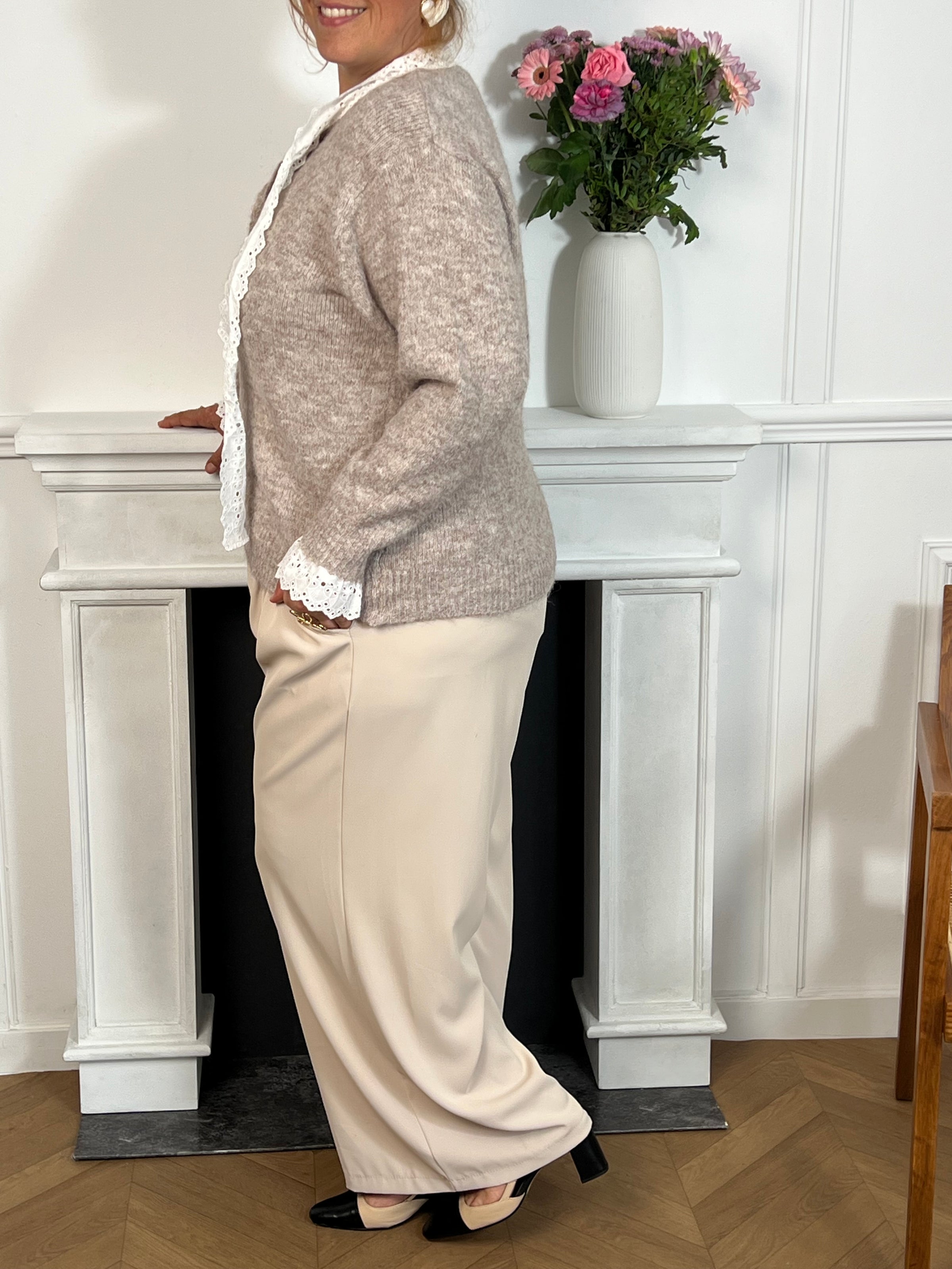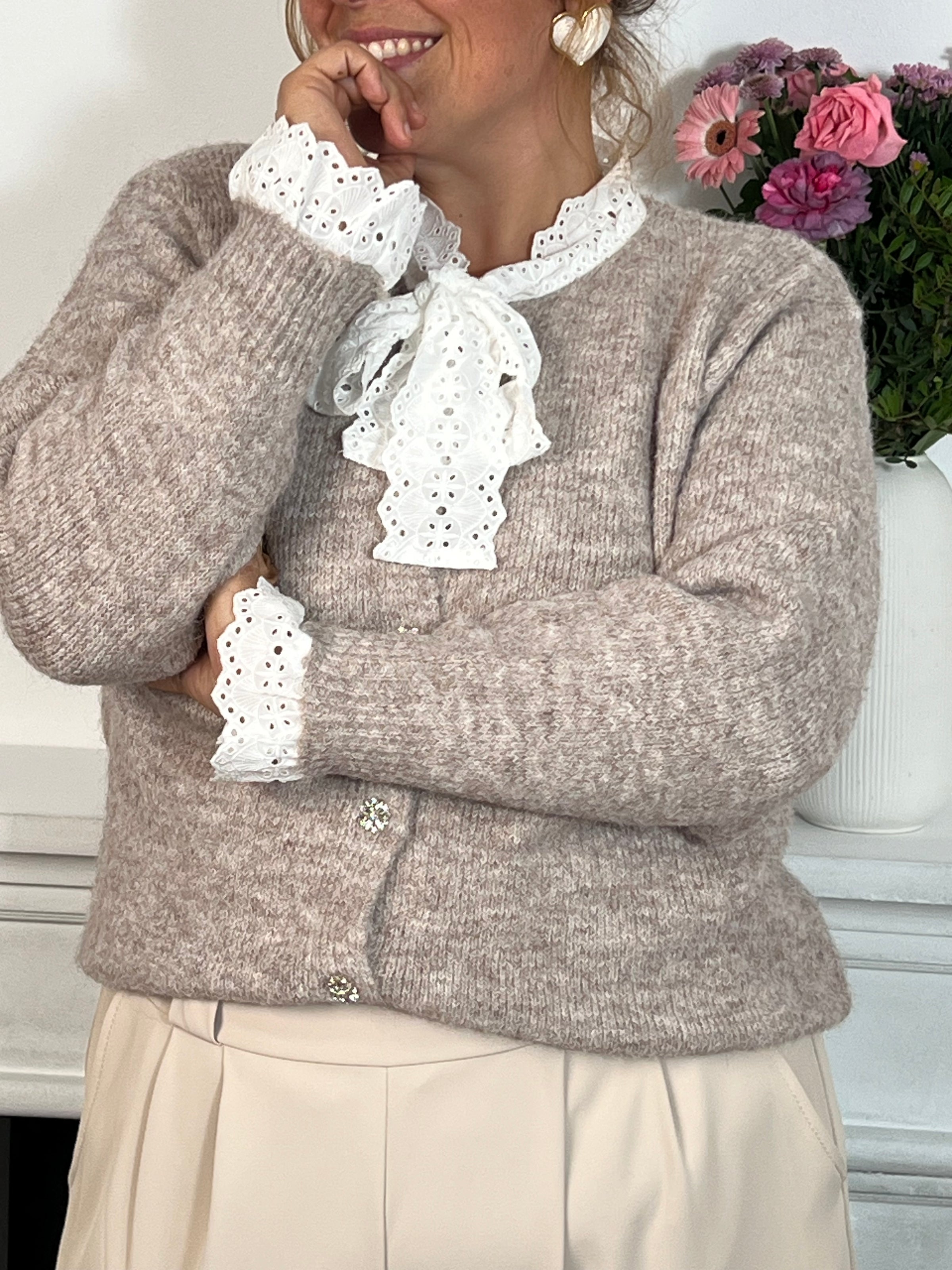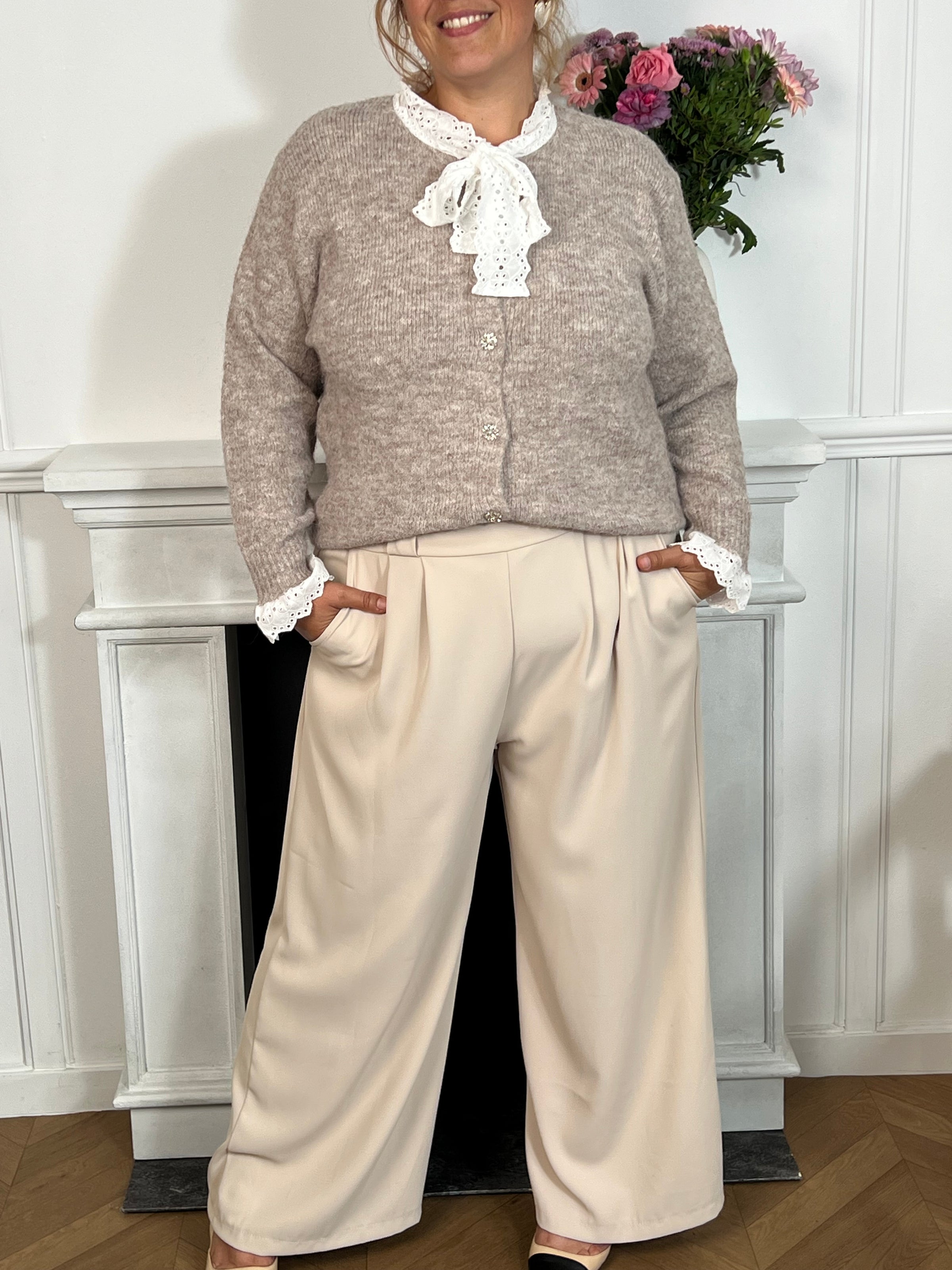 Élégant et raffiné, ce gilet taupe se distingue par ses délicats détails écru qui apportent douceur et contraste. Fermé par de charmants boutons en forme d’étoiles sertis de strass, il allie subtilement confort et éclat, parfait pour sublimer vos tenues avec une touche de chic discret.