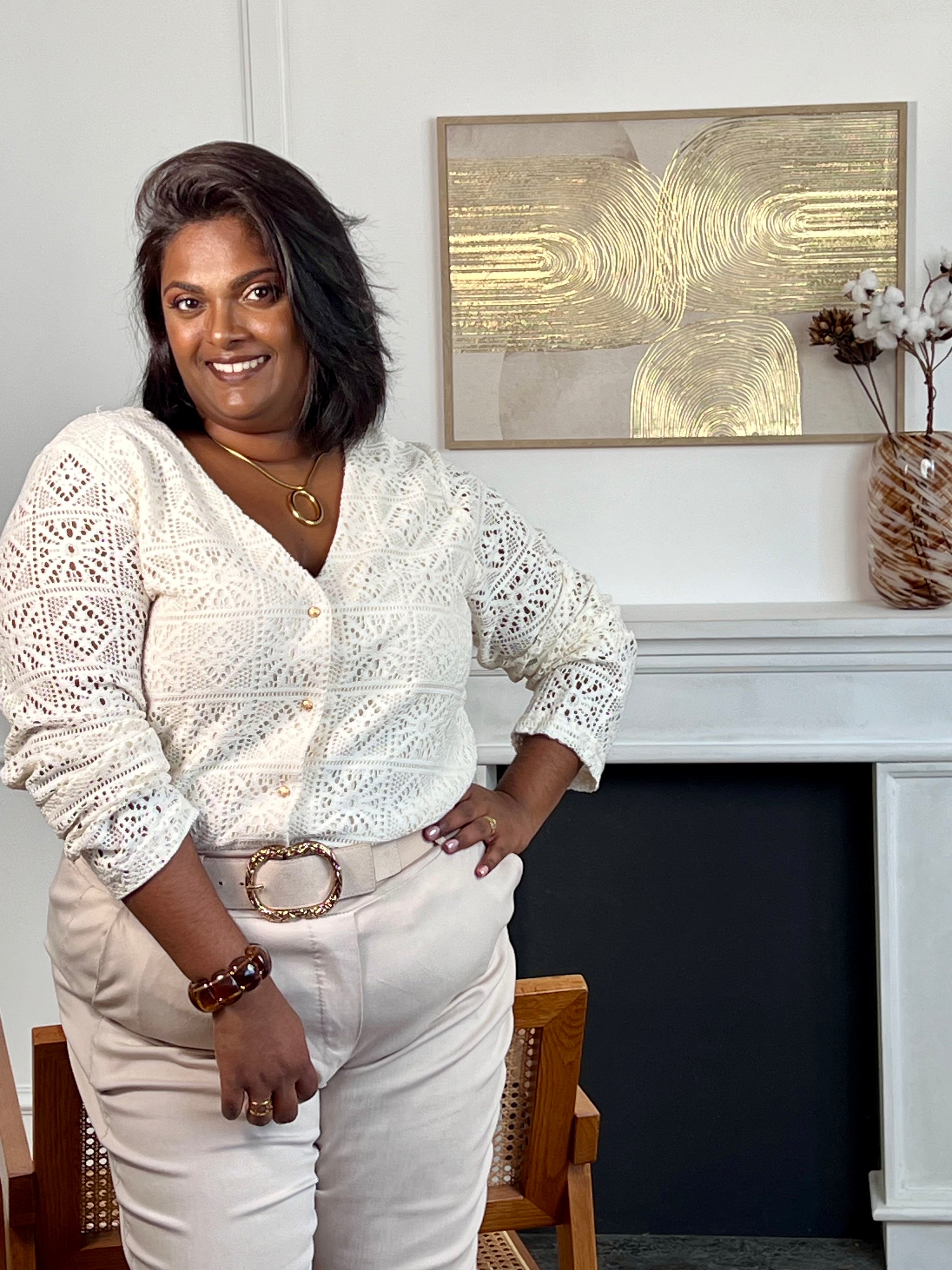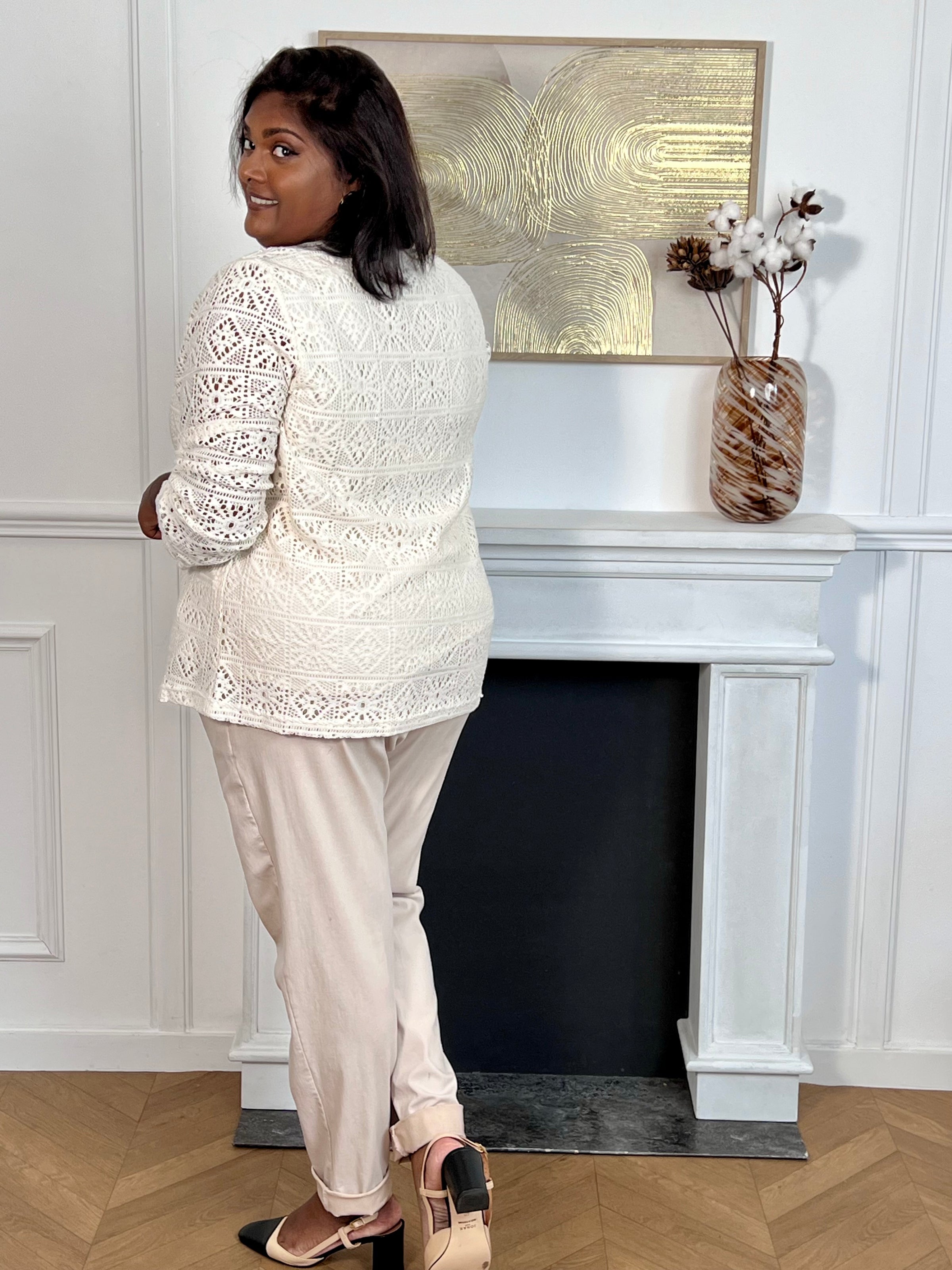 Cette chemise beige en broderie grande taille, modèle Venus, allie élégance et confort. Ses manches longues et son col en V apportent une silhouette flatteuse, tandis que les boutons dorés ajoutent une touche raffinée. Doublée pour plus de douceur, elle met en valeur la délicatesse de la broderie tout en offrant une agréable sensation au porter.