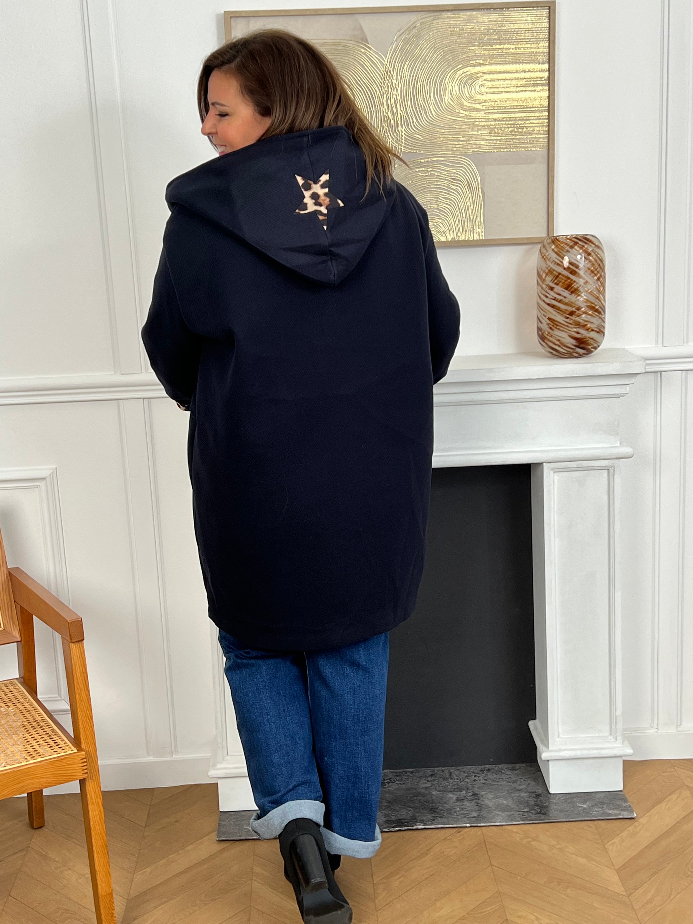 Découvrez notre manteau mi-long bleu marine élégant et tendance, orné de détails léopards sur la capuche et les manches. Pratique et confortable, il dispose de deux poches à l’avant et de boutons sur toute la longueur. Avec sa capuche et son style raffiné, il allie chaleur, originalité et modernité pour un look unique en toute saison.