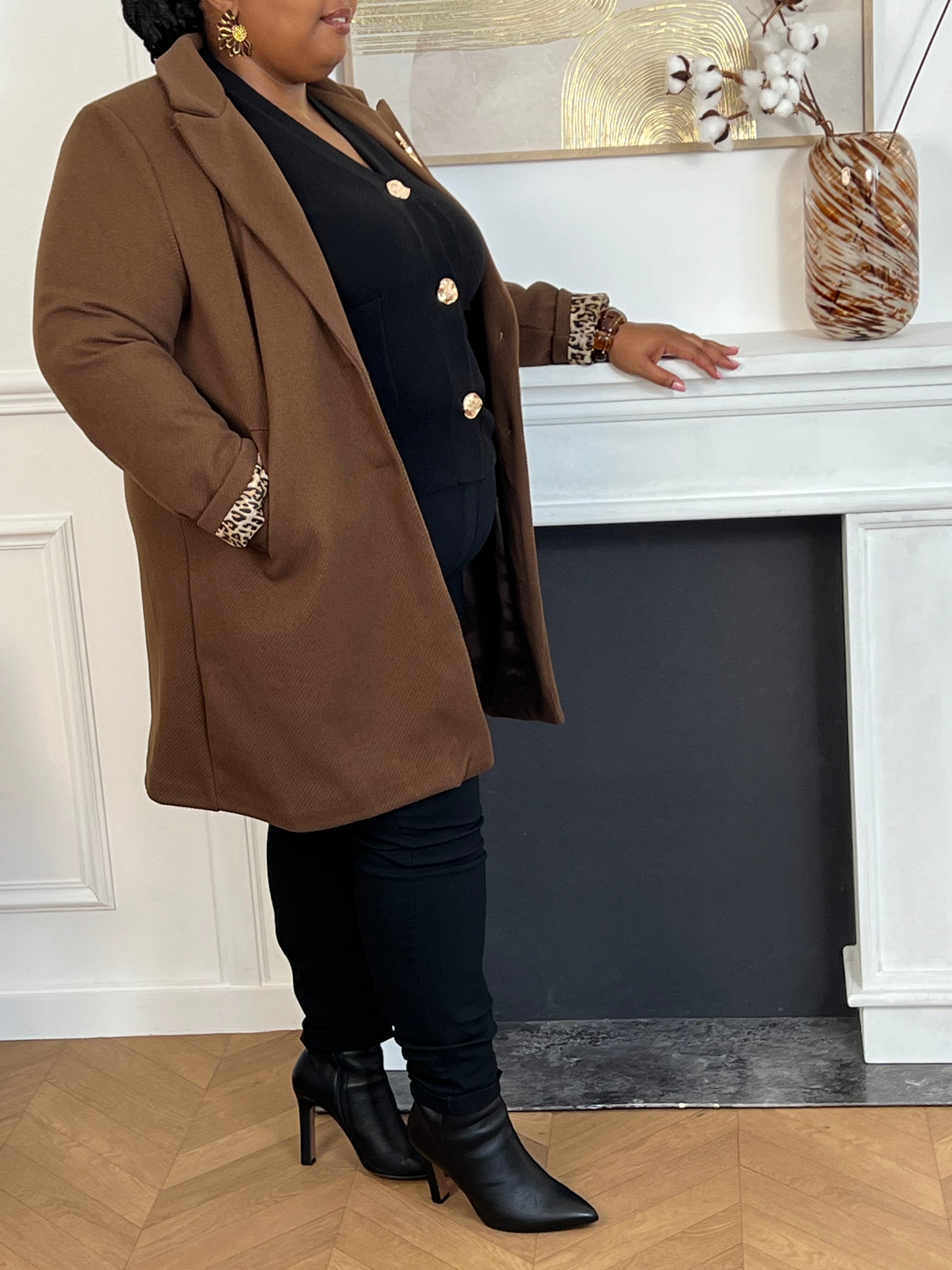 Élégant et raffiné, ce manteau mi-long marron séduit par ses détails sophistiqués. Ses manches à revers dévoilent un intérieur léopard chic et audacieux, offrant une touche de caractère subtile. Les boutons dorés amovibles, délicatement travaillés, viennent parfaire l’ensemble avec une note précieuse et intemporelle.