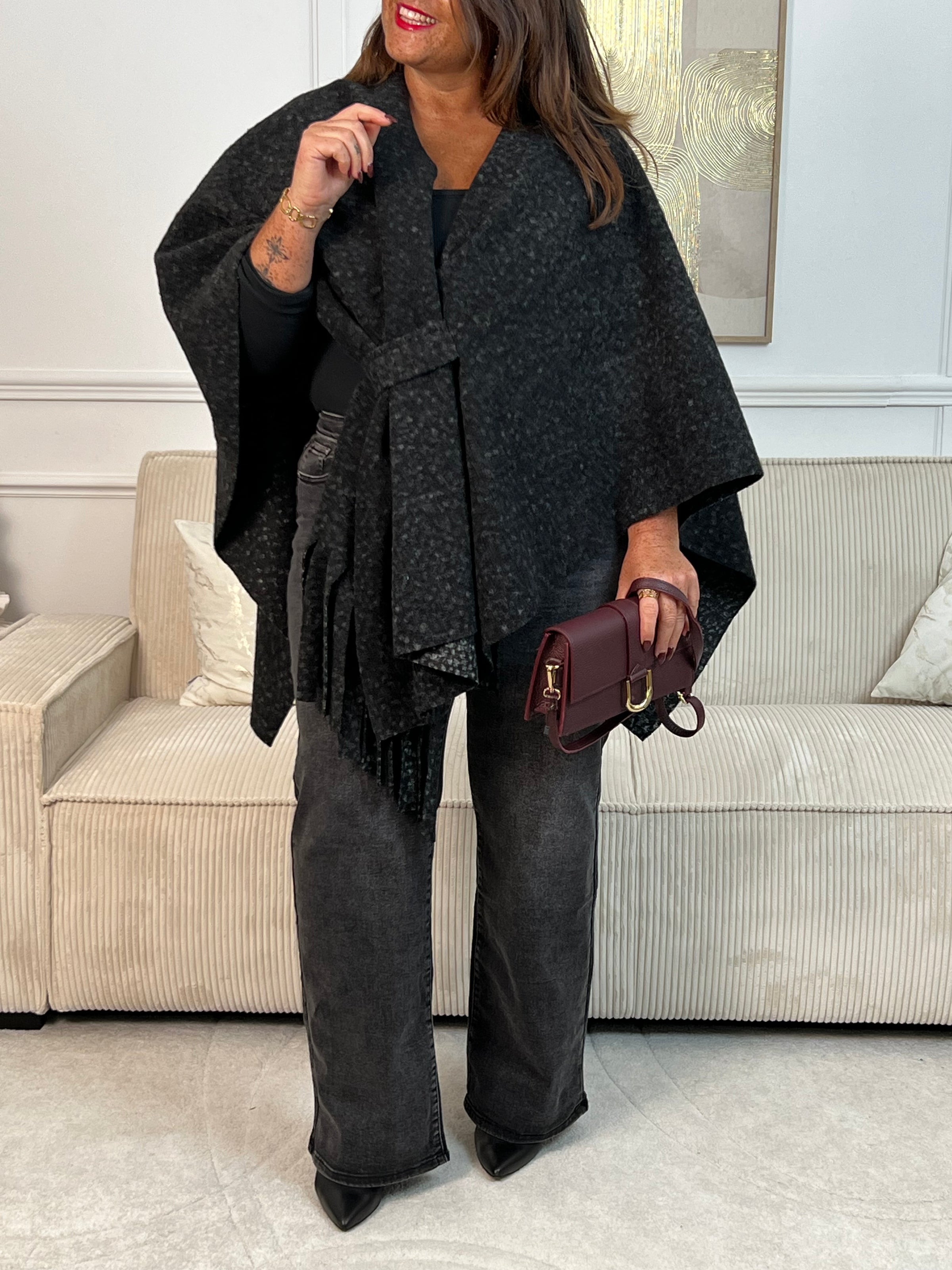 Le Poncho Sorian en gris foncé est la pièce idéale pour un style bohème et fluide. Orné d'une frange latérale élégante et doté d'un passant pour nouer ou fermer, il s'adapte parfaitement à votre silhouette. Confortable et intemporel, ce poncho grande taille accompagne tous vos looks avec grâce.