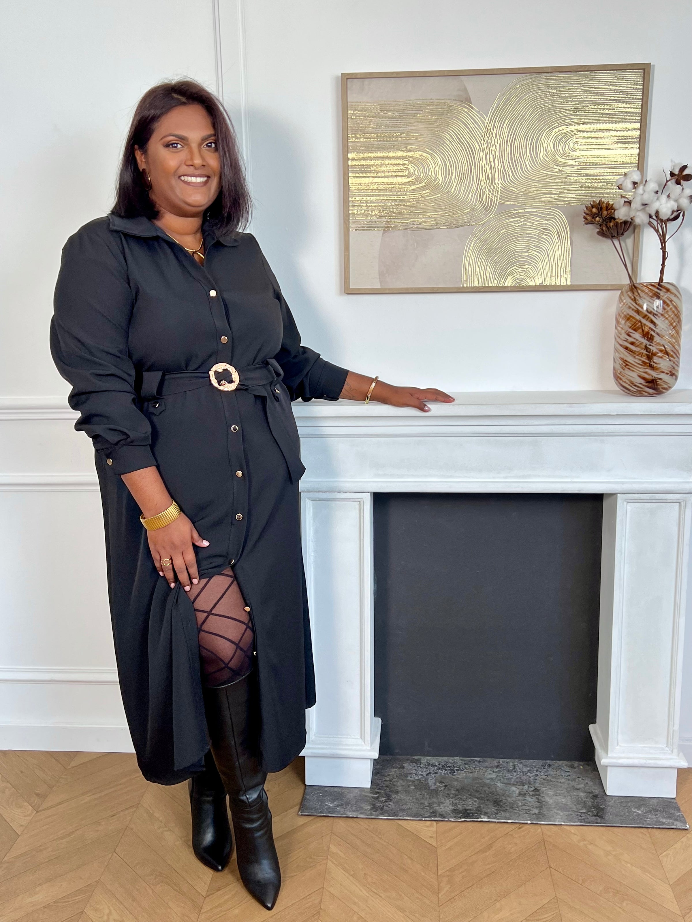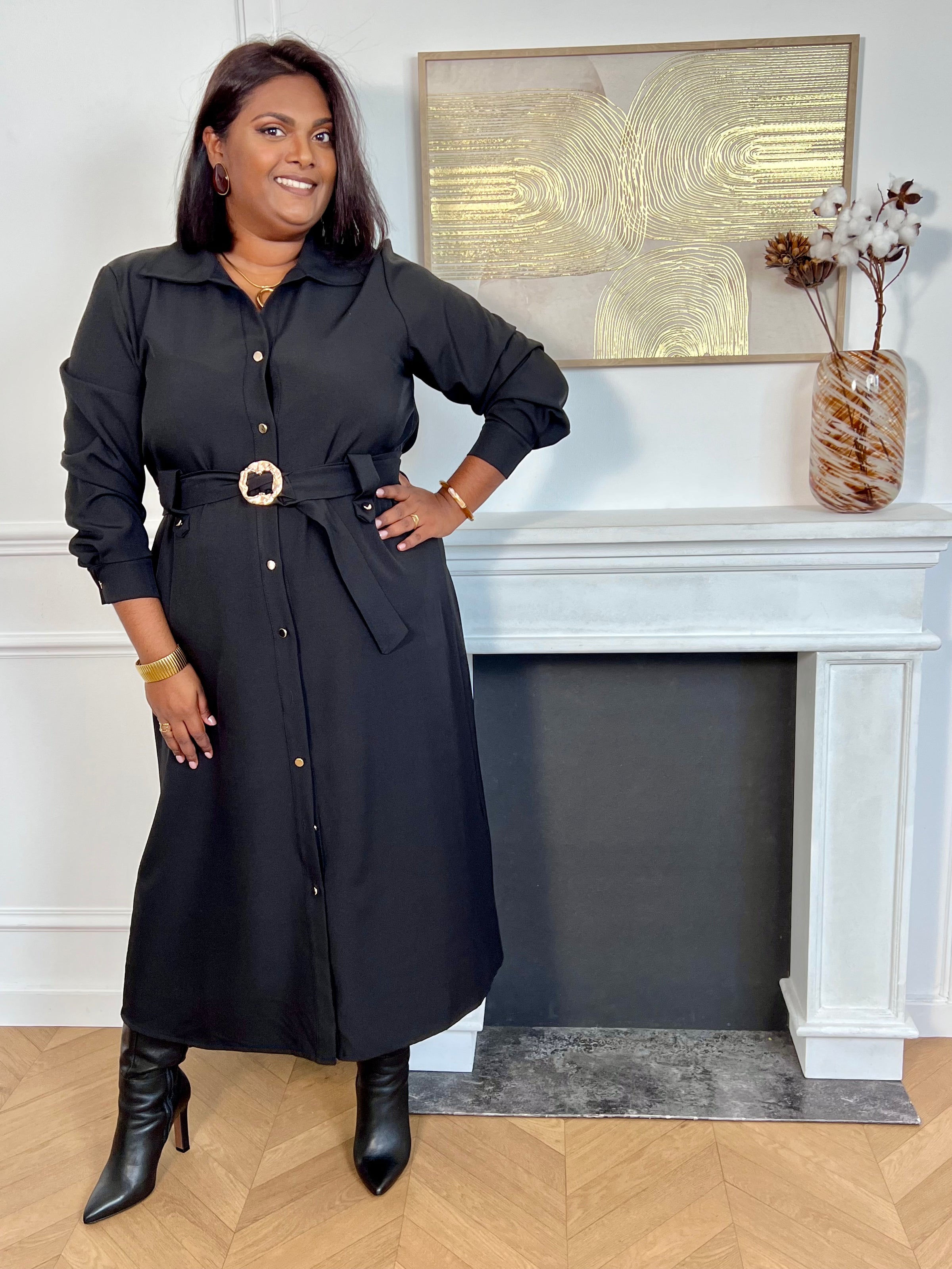 Cette robe longue noire grande taille, Agatha, allie élégance et confort. Dotée de manches longues et d’un col chemise, elle s’ouvre sur une série de boutons dorés tout au long du devant et aux manches, apportant une touche raffinée.