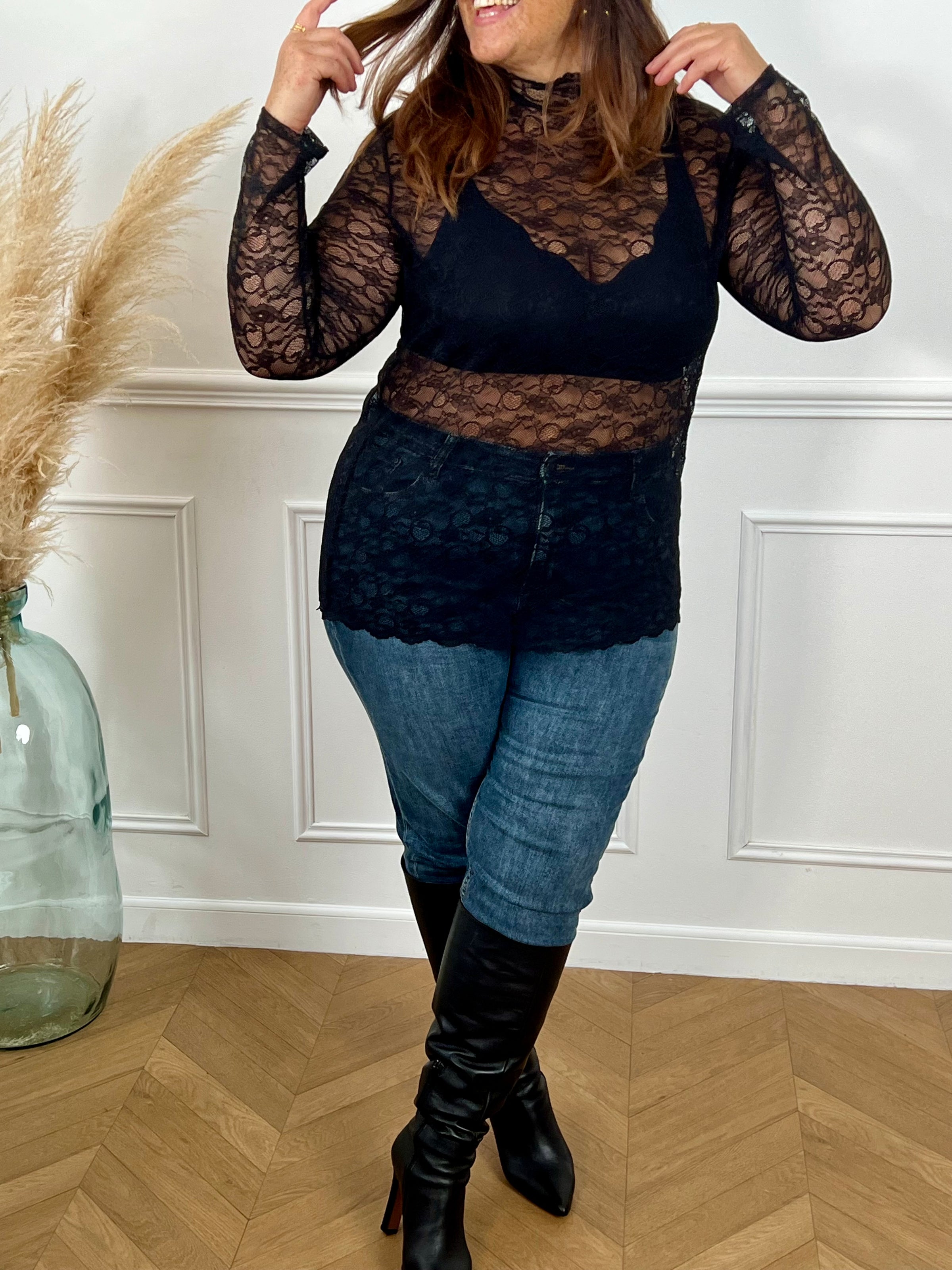 Ce top noir en dentelle élégant offre une allure féminine grâce à son col montant festonné et sa dentelle féminine. Conçu spécialement pour les tailles plus grandes, il est confortable et flatteur.