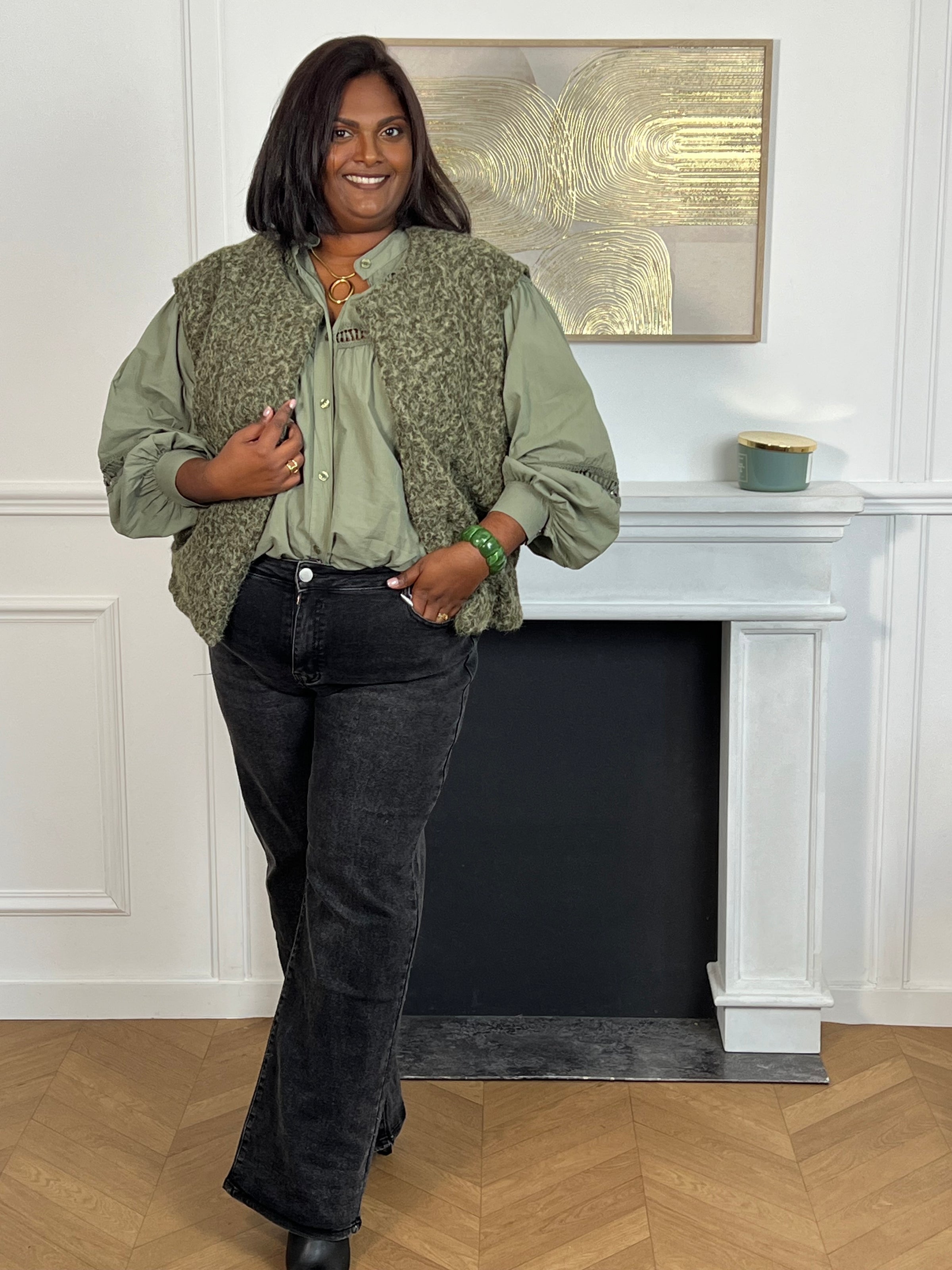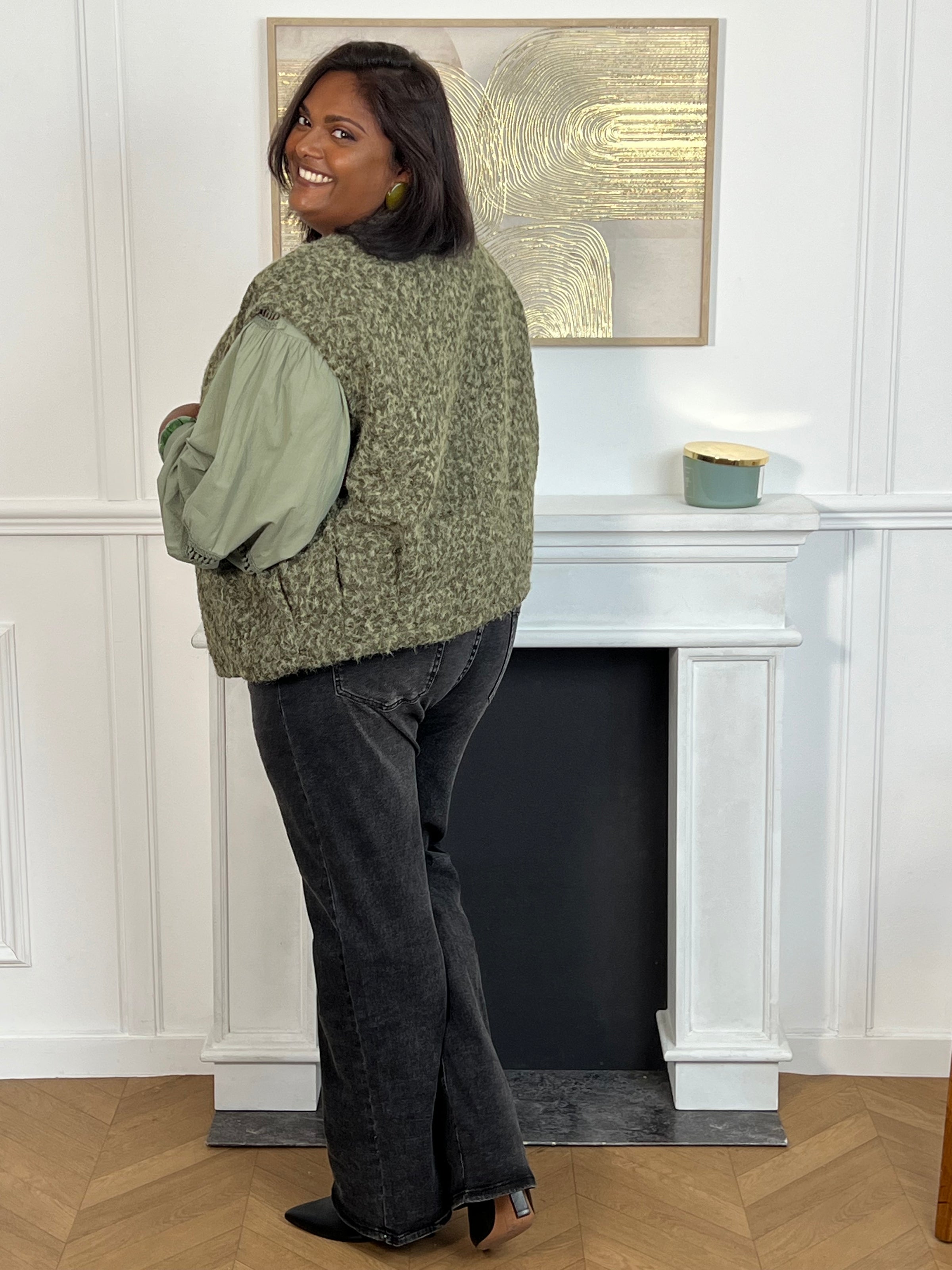 Découvrez notre veste sans manches femme couleur kaki, à l'effet moumoute tendance et douce. Son col V élégant est rehaussé d'une broche dorée amovible sur le devant pour un style raffiné. Une pièce moderne et confortable, idéale pour compléter vos tenues d'automne et d'hiver.