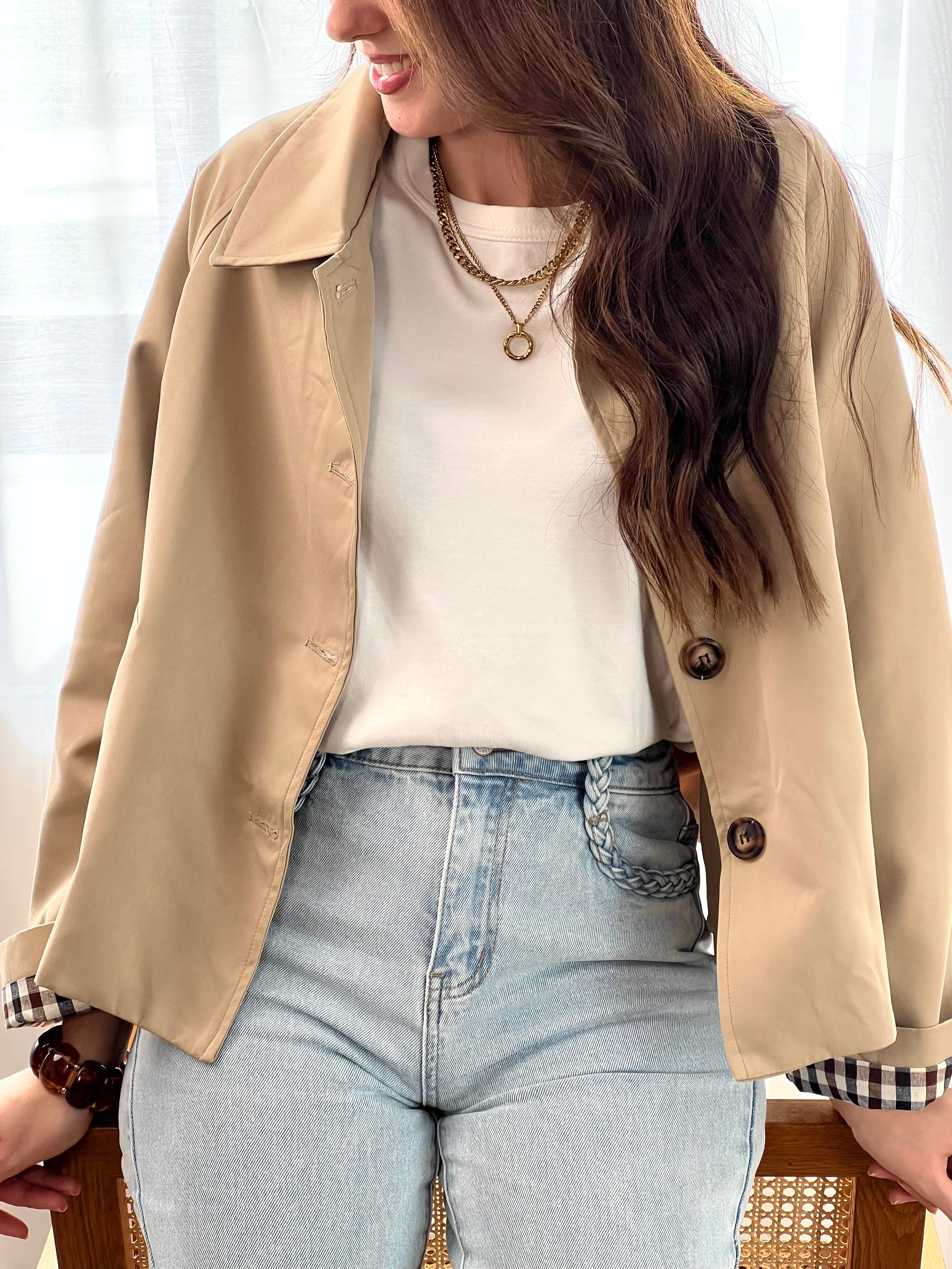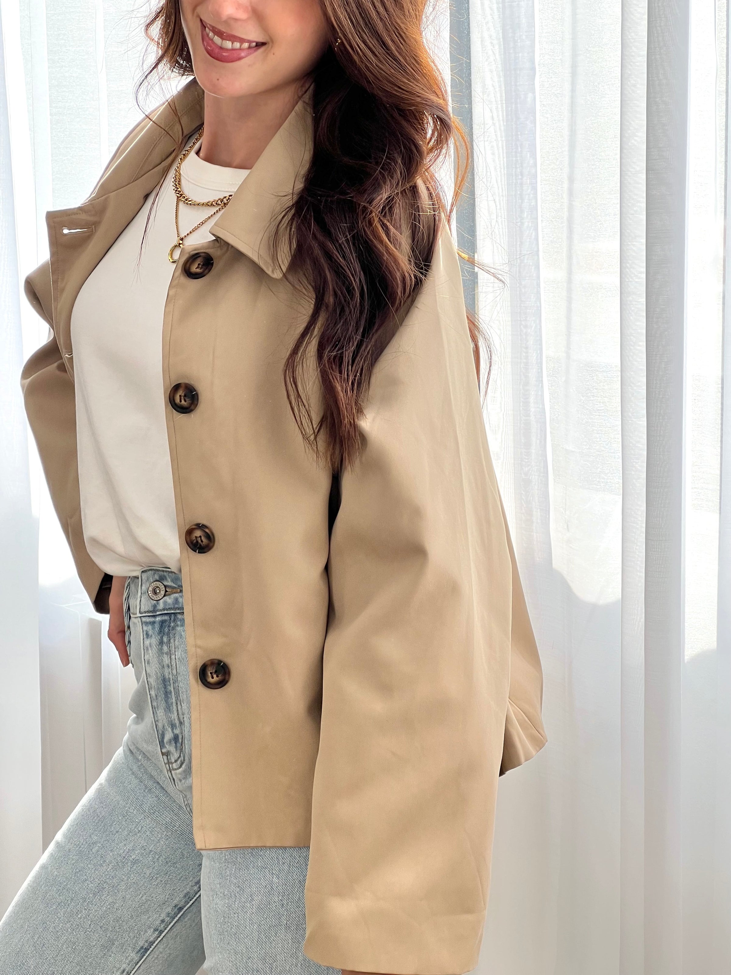 Découvrez notre trench court Eda, la pièce incontournable pour sublimer vos tenues. Confectionné en beige intemporel, ce manteau allie élégance et polyvalence.