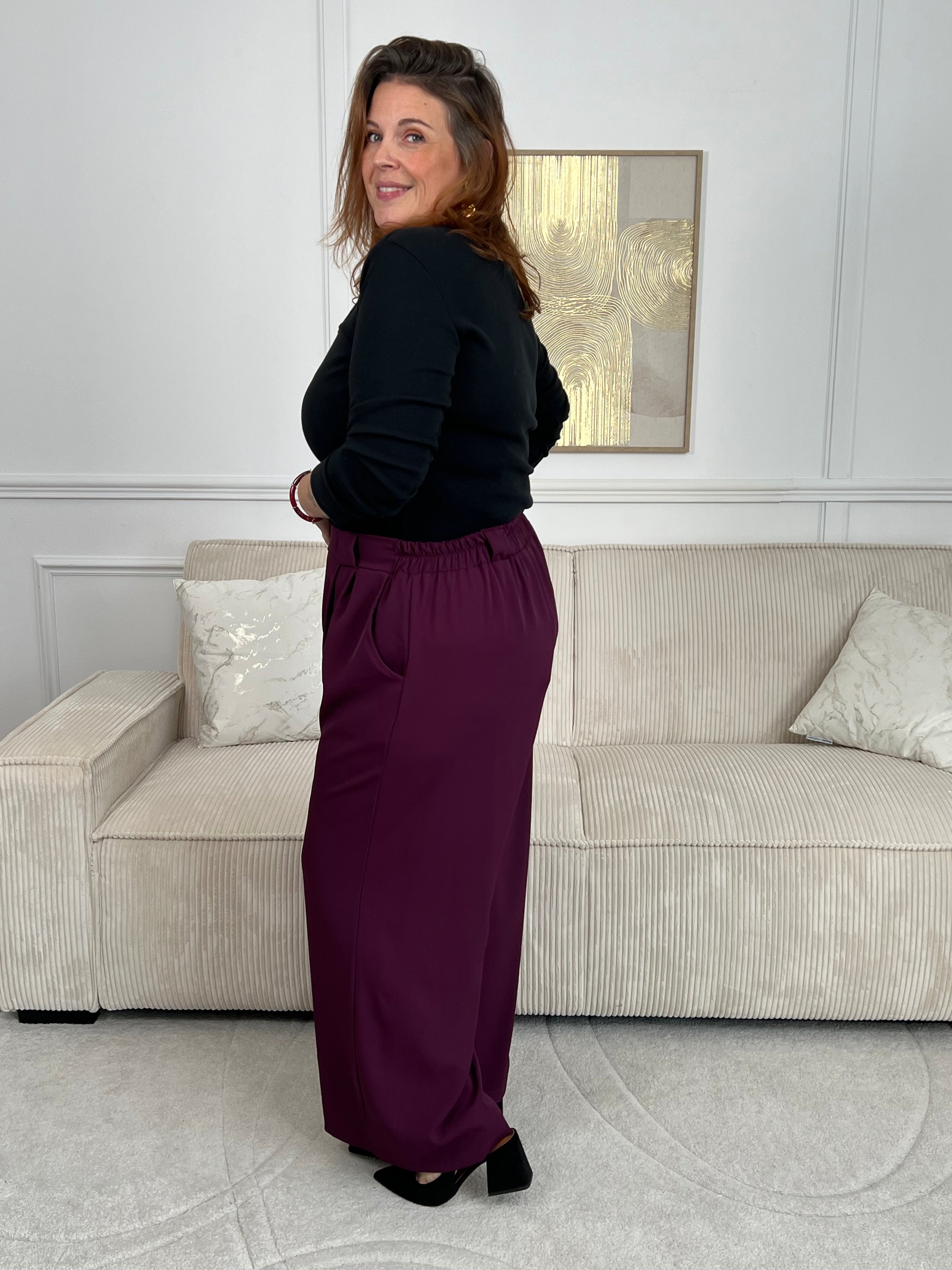Ce pantalon prune coupe droite grande taille pour femme est l'élégance incarnée. Avec sa matière fluide, il offre un confort optimal et sa coupe droite flatteuse convient à toutes les morphologies. L'élastique au dos garantit un ajustement parfait et les passants pour ceinture sont pratiques. Ajoutez-y un style sophistiqué avec ses deux poches latérales.