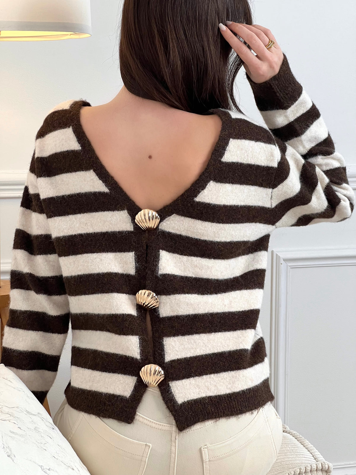 Le pull Celestina combine élégance et sensualité avec son dos nu en V à lien noué et ses manches longues. Orné de fil lurex doré, ce pull beige et doré brille de mille feux. Son col rond festonné ajoute une touche de raffinement pour des occasions spéciales.