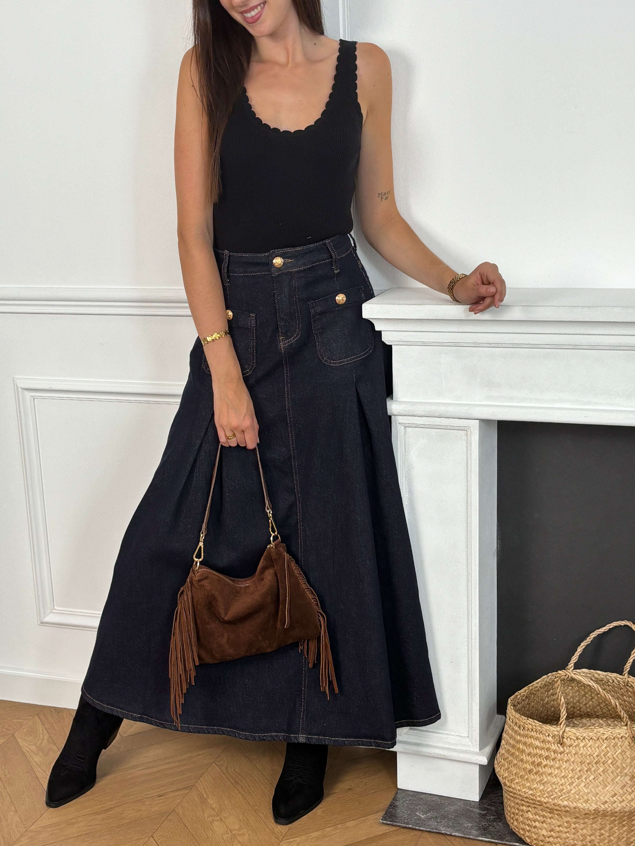 Cette jupe longue en jean bleu foncé offre une coupe évasée confortable. Pratique avec ses multiples poches et ses passants pour ceinture, elle se distingue par ses élégants boutons dorés.