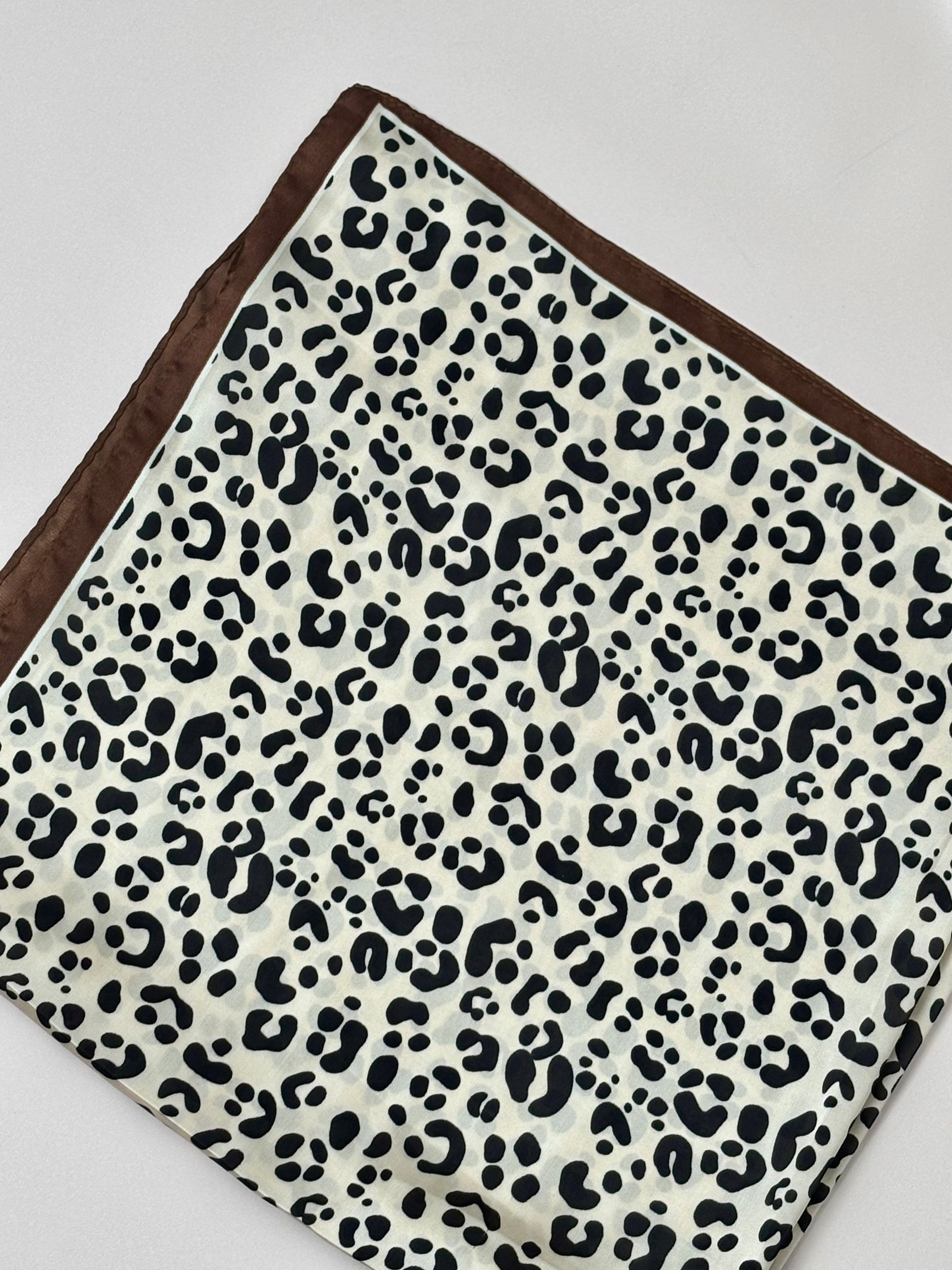 Ce foulard allie élégance et originalité avec ses motifs léopards audacieux. Sur un fond beige doux, sa bordure marron apporte une touche chaleureuse, parfaite pour sublimer n'importe quelle tenue. Léger et polyvalent, il vous accompagne avec style tout au long de la journée.