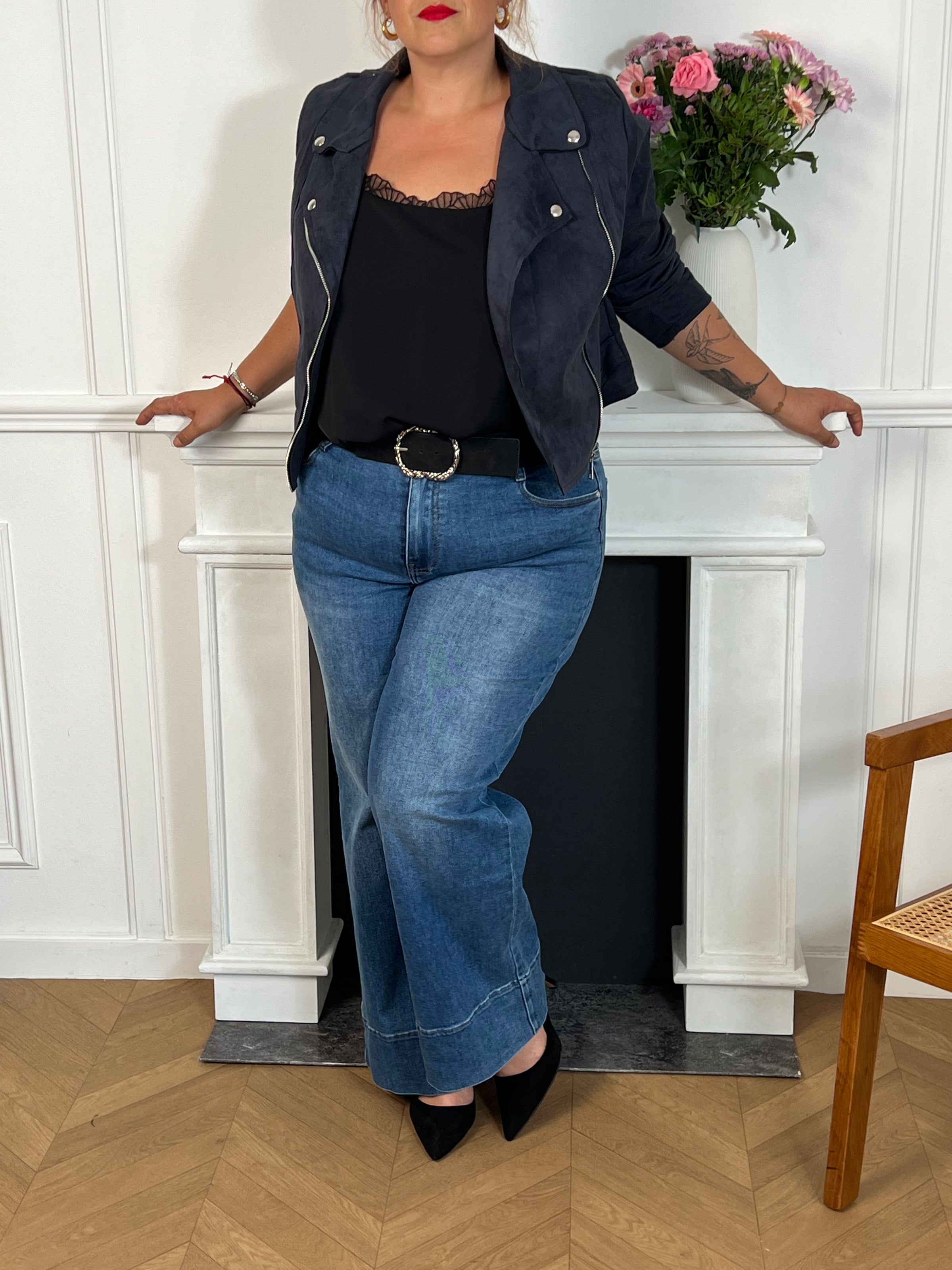 Ce perfecto bleu marine grande taille, modèle Calista, allie élégance et confort. Ses manches longues et son col revers apportent une touche classique, tandis que la fermeture éclair et les boutons argentés ajoutent un détail raffiné.